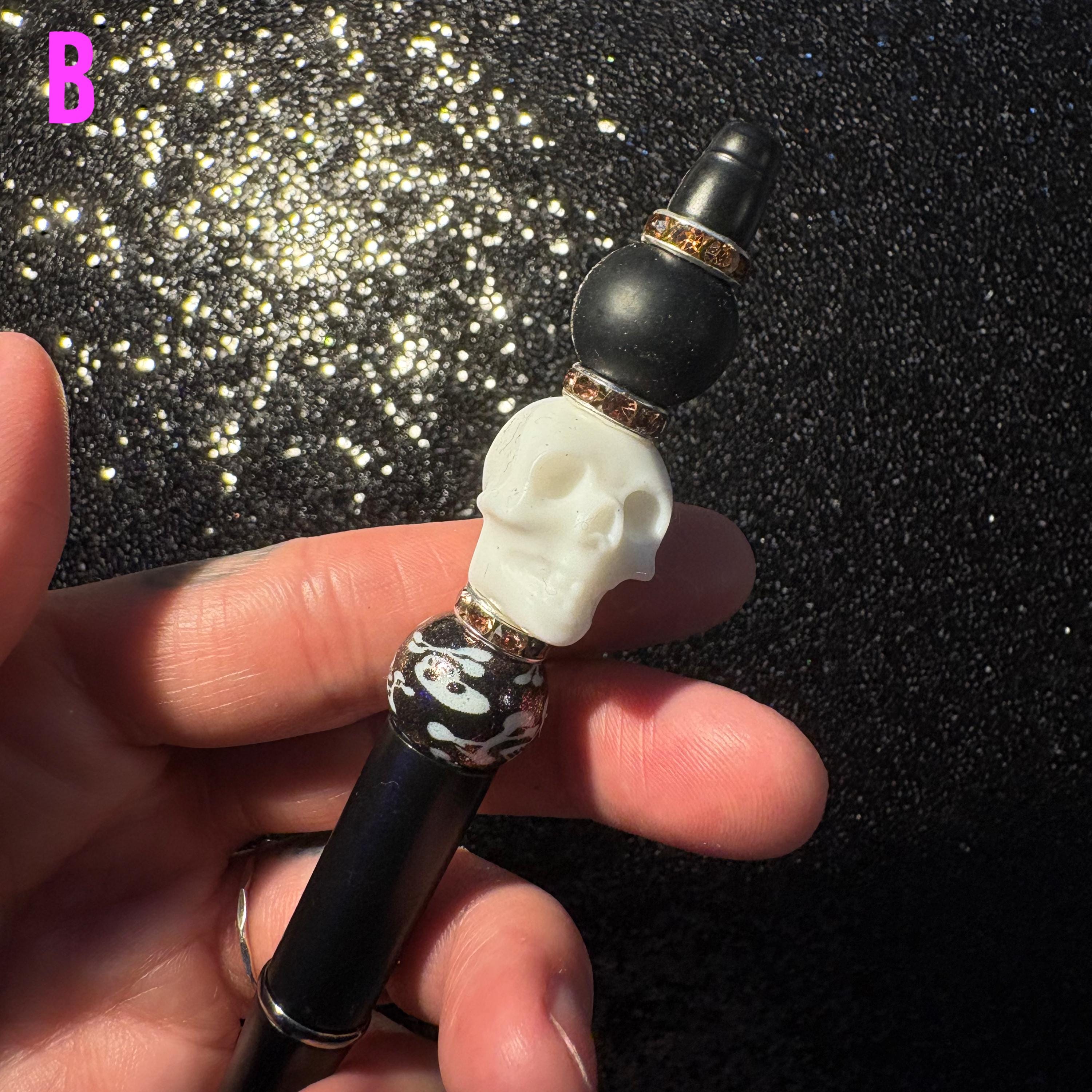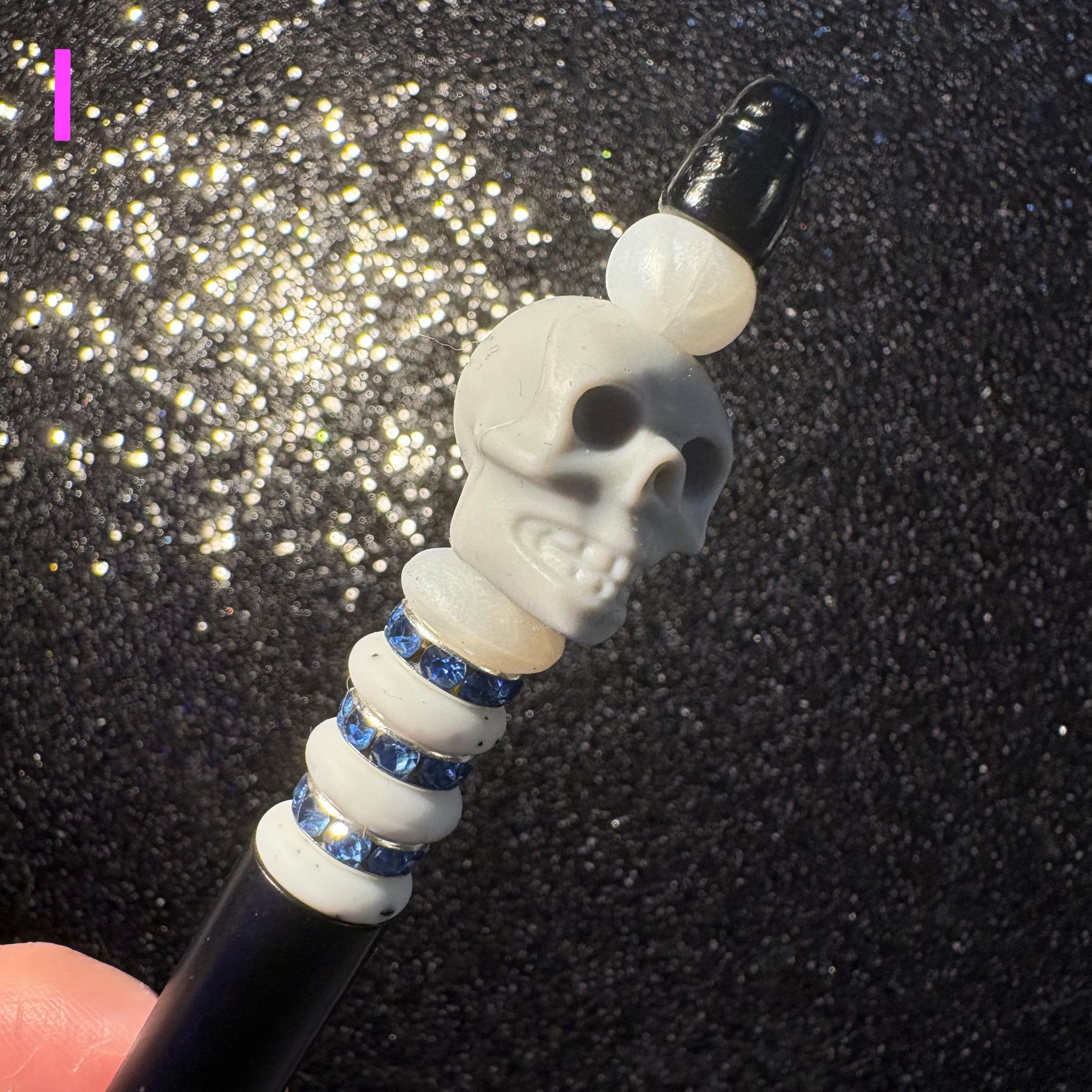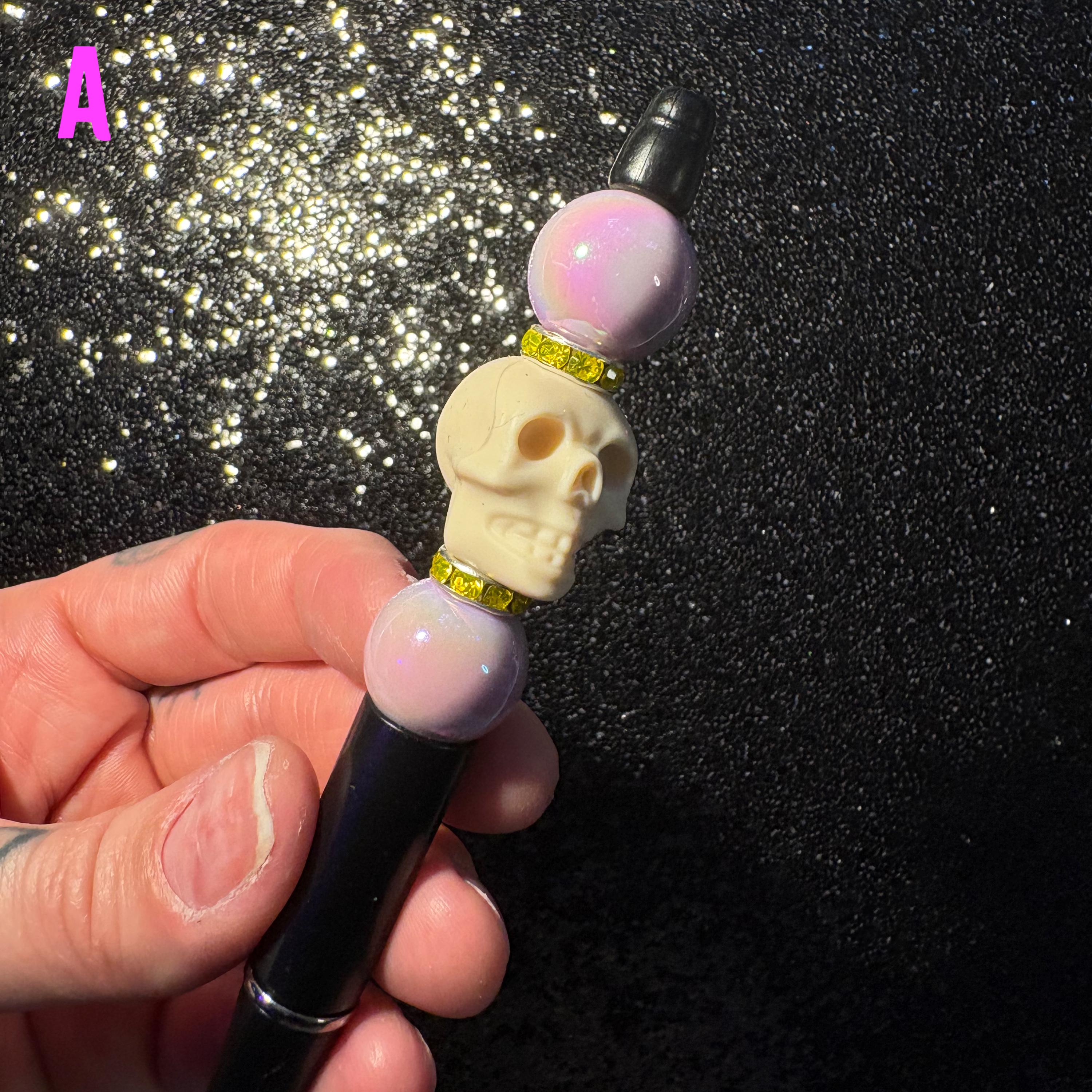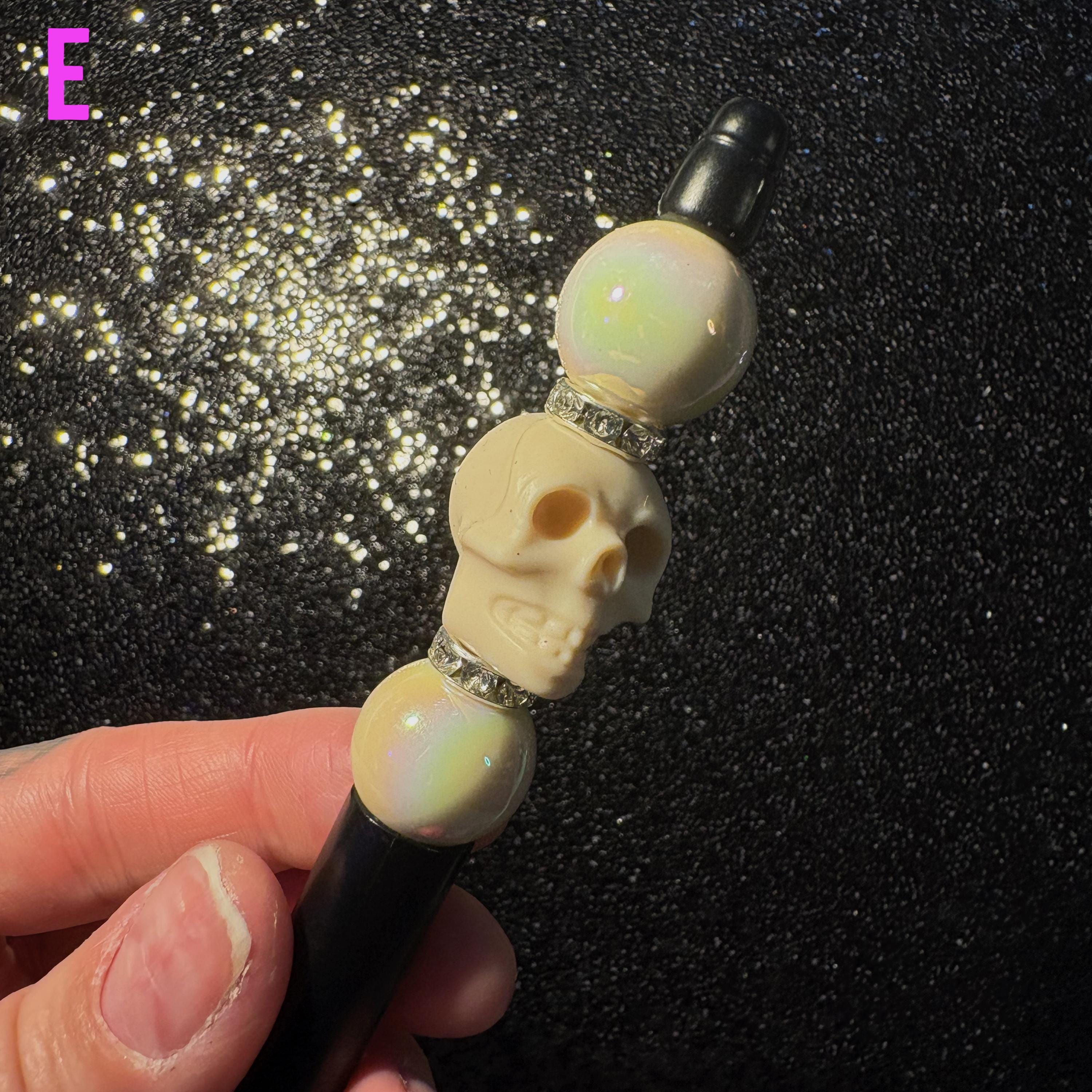 These Skullicious Beaded Pens feature a mix of silicone and pearlescent beads, paired with bold skull accents for a perfect blend of gothic, cute, and alt aesthetics. Each pen is hand-assembled and completely unique—no two are exactly the same.