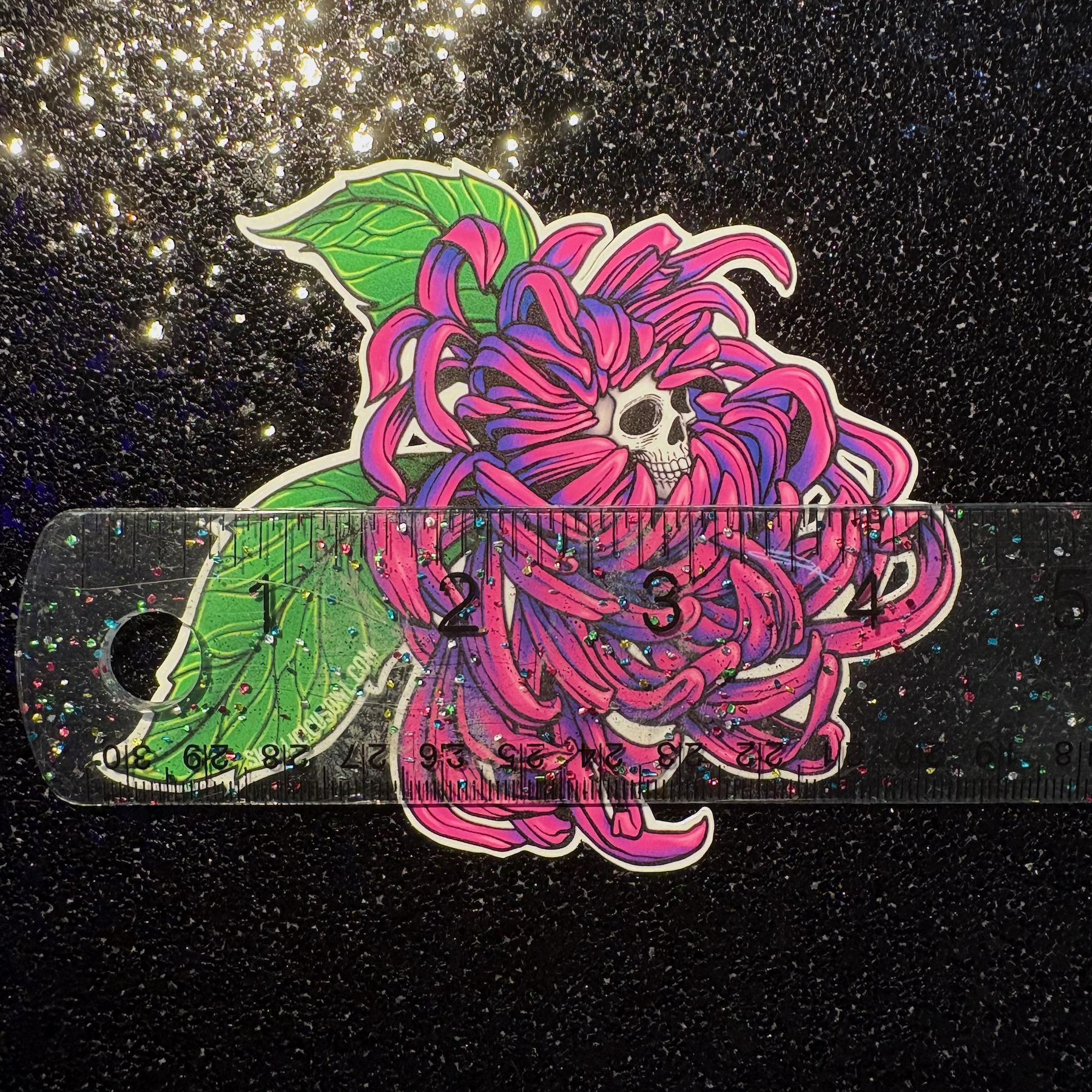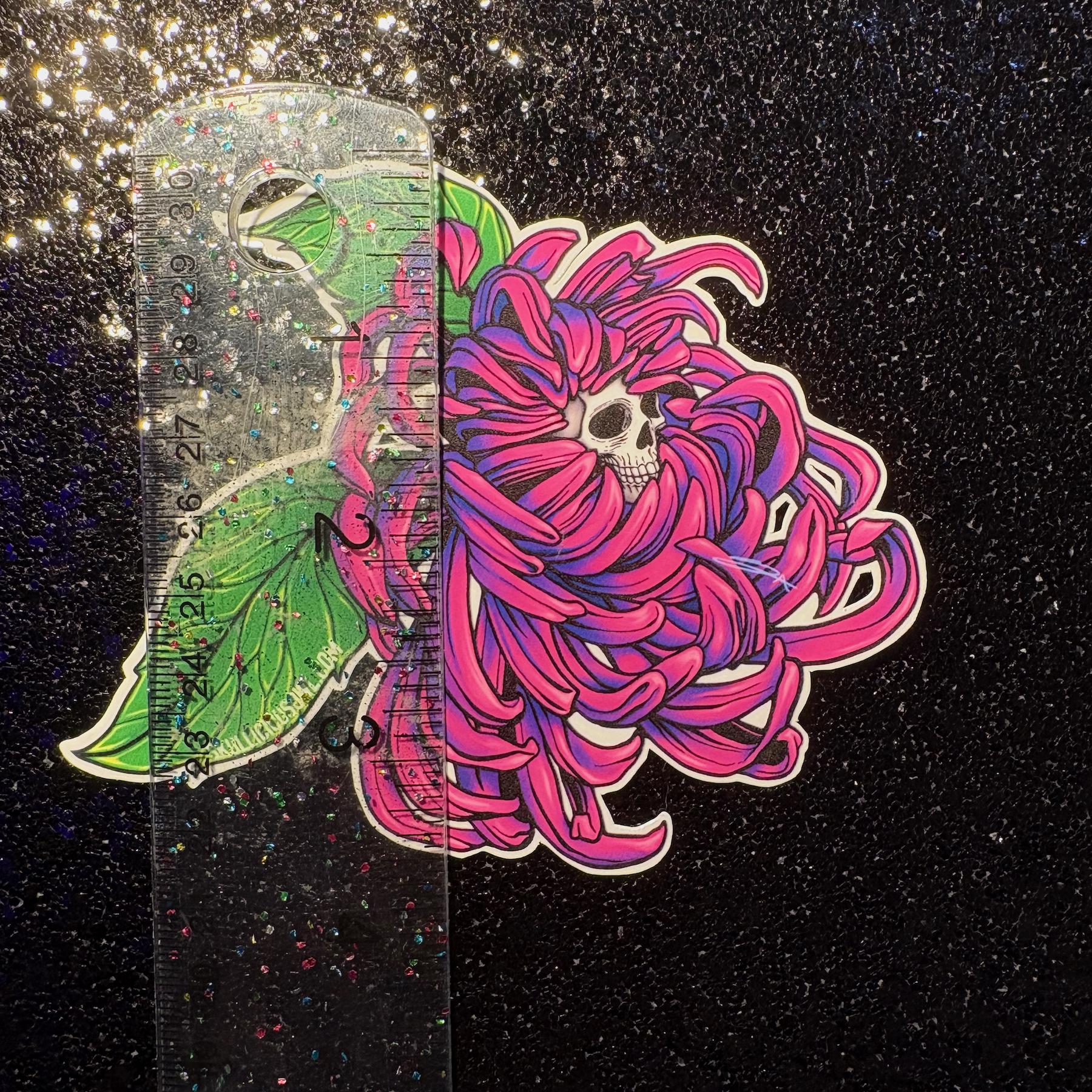 This Fuchsia Chrysanthemum Skull Sticker features a striking floral bloom with a hidden skull at its center—blending vivid color with gothic tattoo-style design. The glossy finish enhances the rich fuchsia and deep purple tones, making this piece truly pop.